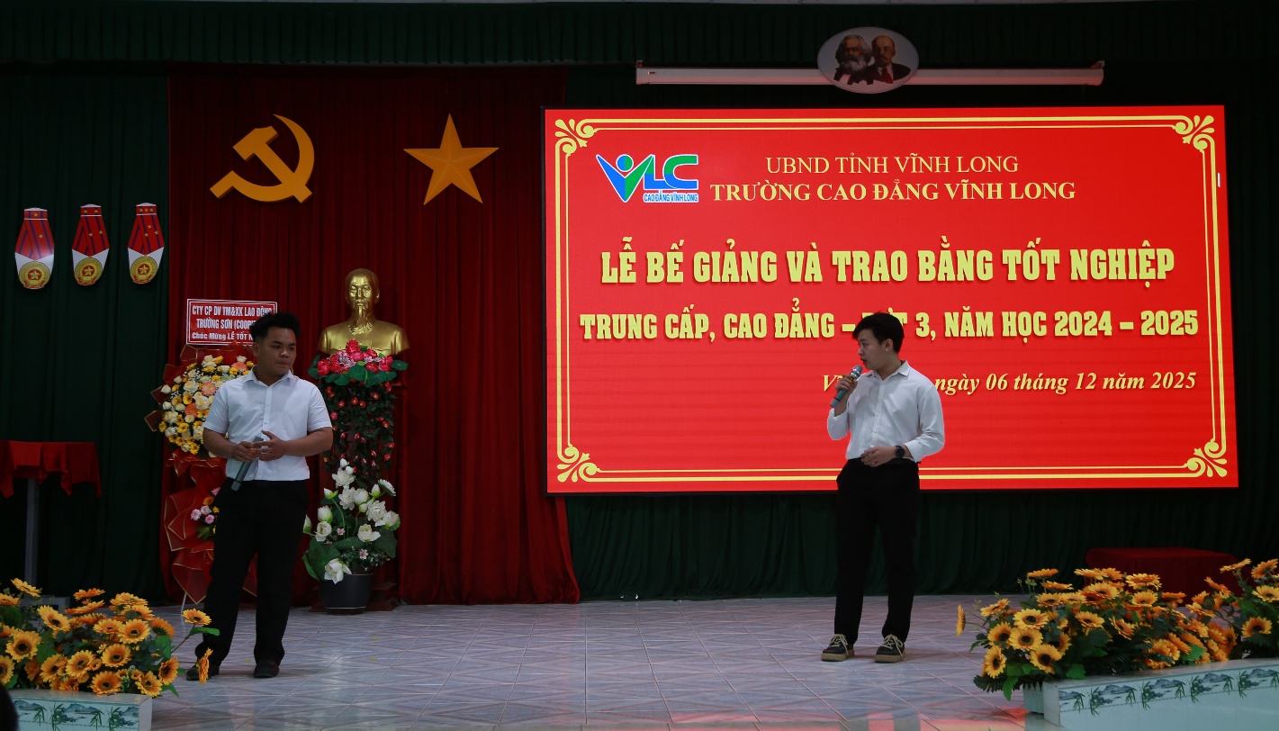 Trải qua những năm tháng nỗ lực học tập và rèn luyện, bao niềm vui và những khó khăn trên giảng đường đã qua, giờ đây những kỷ niệm còn đọng lại dưới mái trường Cao đẳng Vĩnh Long sẽ tiếp bước các em trên đường đời. Em Lưu Thanh Sơn, lớp Trung cấp TT&BVTV2023 đại diện học sinh, sinh viên gửi lời tri ân sâu sắc đến công lao giảng dạy tận tình của thầy cô, lễ tốt nghiệp hôm nay như một bước đánh dấu sự trưởng thành, nâng bước các em vững bước trong tương lai. Chúc thầy cô, cùng toàn thể các bạn vững vàng và thành công trên con đường đã chọn.