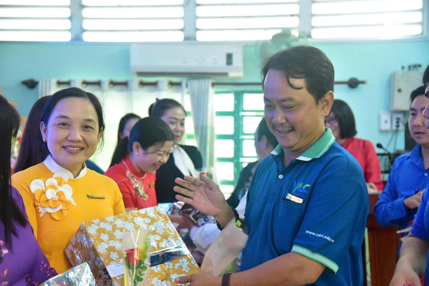 Hình 6. Thầy Ngô Hải Đăng – Chủ tịch công đoàn tặng hoa và quà cho viên chức nữ.