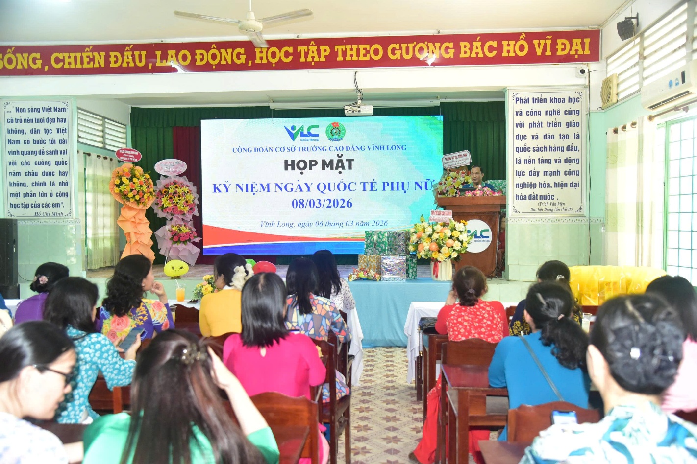 Vào lúc 15 giờ 00 ngày 06/3/2026, tại Hội trường A, Công đoàn cơ sở Trường Cao đẳng Vĩnh Long đã tổ chức buổi họp mặt kỷ niệm với sự tham dự của Ban Giám hiệu, Ban Chấp hành Công đoàn và đông đảo nữ VC–NLĐ.